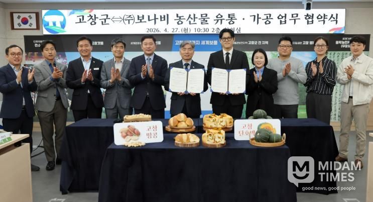 고창군은 지난 27일 군청에서 ㈜보나비와 ‘고창 농산물 유통·가공 활성화를 위한 업무협약(MOU)’을 체결했다고 밝혔다.