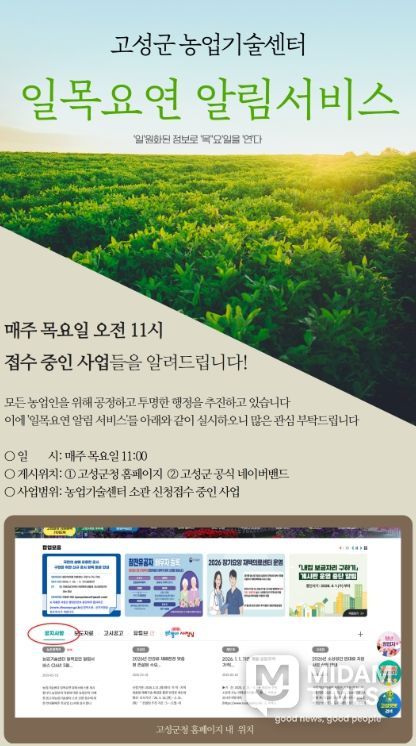 '일목요연 알림 서비스'는 매주 목요일 오전 11시 고성군 누리집과 공식 네이버 밴드를 통해 게시된다.
