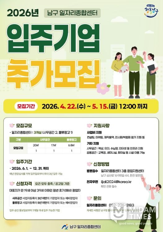 미담타임스 김준완 기자 | 울산 남구는 청년들에게 창업공간을 지원해 안정적으로 사업을 수행할 수 있도록 남구 일자리 종합센터 사무공간 및 물류창고에 입주할 기업을 추가 모집하고 있다고 28일 밝혔다.