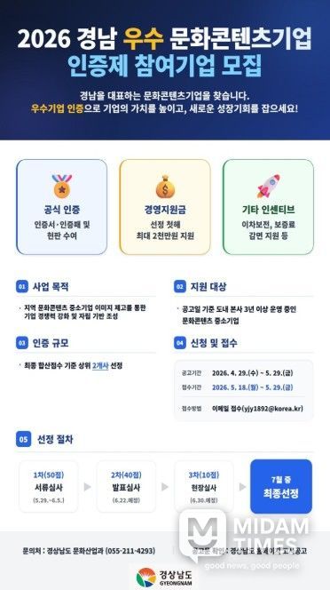 미담타임스 황명수 기자 | 경상남도는 ‘2026년 경남 우수 문화콘텐츠기업 인증제’ 참여 기업을 4월 29일부터 5월 29일까지 한 달간 모집한다고 밝혔다.