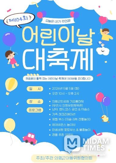 미담타임스 조혜리 기자 | 의령군은 다음달 5일 제104회 어린이날을 맞아 의령군민공원 기오름마당에서 ‘제104회 의령군 어린이날 대축제’를 개최한다고 밝혔다. 이번 행사는 의령군아동위원협의회가 주관한다.