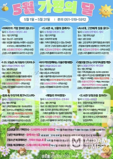 미담타임스 남혜영 기자 | 부산 금정구 금샘도서관은 5월 가정의 달을 맞아 오는 5월 1일부터 31일까지 작가(유튜버) 강연, 클래식 공연, 체험행사 등 온 가족이 함께 즐길 수 있는 '가정의 달' 특별 프로그램을 운영한다고 밝혔다.