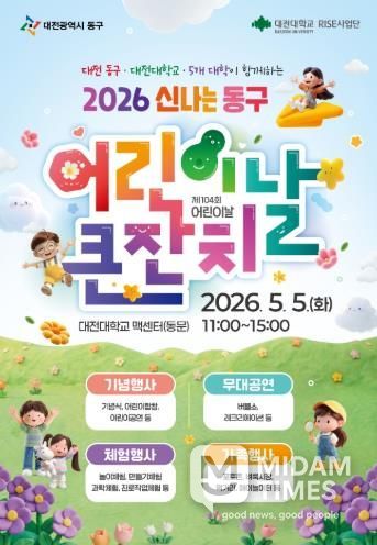 미담타임스 조혜리 기자 | 대전 동구는 제104회 어린이날을 맞아 오는 5월 5일 오전 11시부터 대전대학교 맥센터 실내체육관에서 ‘동구 미래의 주인공들과 함께하는 어린이날 큰잔치’를 개최한다고 28일 밝혔다.