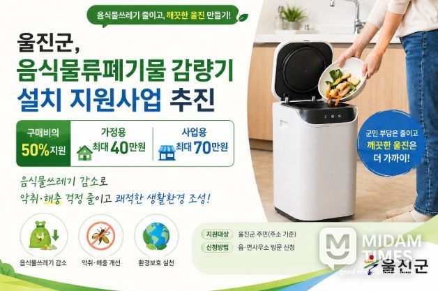 미담타임스 김준완 기자 | 울진군은 음식물쓰레기의 발생량 감소와 군민 생활환경 개선을 위해 ‘음식물류폐기물 감량기 설치 지원사업(3차)’을 오는 5월 22일까지 선착순으로 모집한다.
