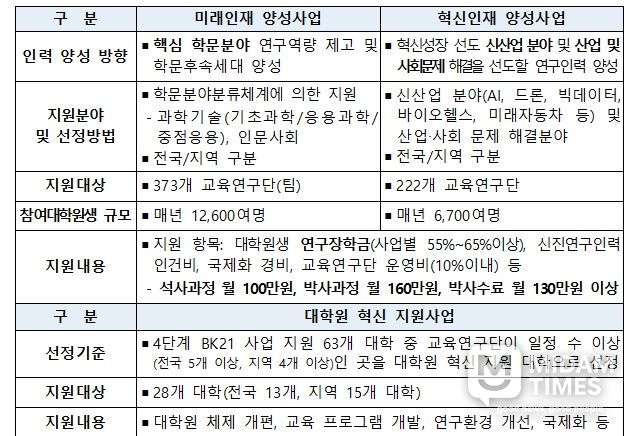 두뇌한국(BK)21 사업은 석·박사급 인재 양성 및 세계 수준의 연구중심대학 육성을 목표로 1999년부터 추진되어 온 대표적인 대학원 지원 사업이다. 현재 4단계 사업(7년, ’20.9.~’27.8.)이 운영 중이며, 매년 약 2만 명의 대학원생과 신진 연구자를 지원하고 있다.