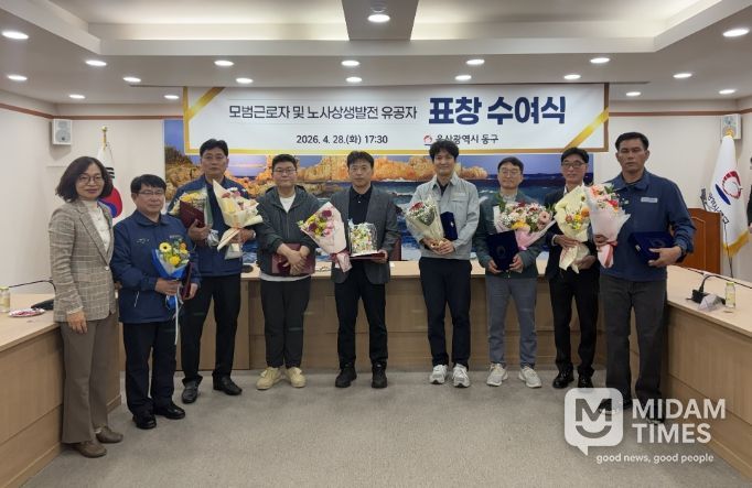 미담타임스 김준완 기자 | 울산 동구는 4월 28일 오후 5시 30분 동구청 2층 상황실에서 모범 근로자 및 노사 상생발전 유공자 10명에게 표창을 수여했다.