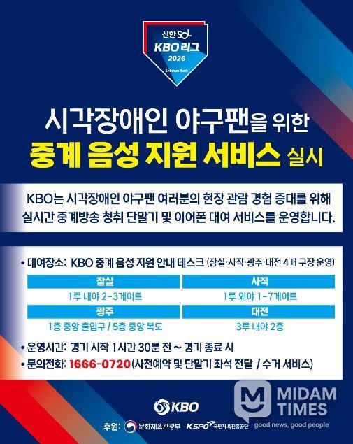 미담타임스 박민정 기자 | KBO는 2023년부터 잠실, 사직, 광주 구장에서 운영해 온 ‘KBO 리그 시각장애인 현장 관람객 대상 중계 음성 지원 서비스’를 올해 대전 한화생명 볼파크까지 확대해 총 4개 구장에서 운영한다.