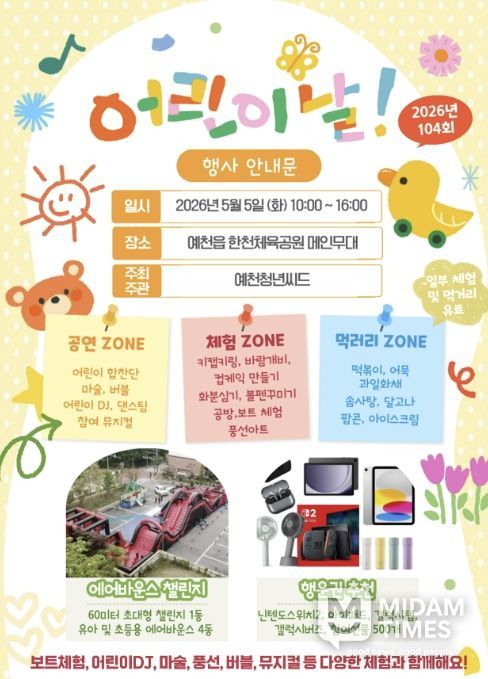 미담타임스 김준완 기자 | 예천군은 제104회 어린이날을 맞아 오는 5월 5일 오전 10시부터 오후 4시까지 한천체육공원 메인무대 일원에서 ‘2026년 제104회 예천군 어린이날 기념행사’를 개최한다.
