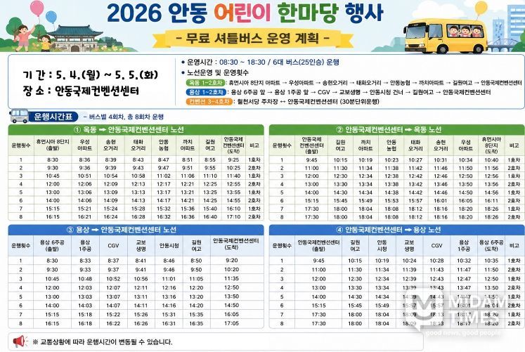 미담타임스 김준완 기자 | 안동시와 안동청년회의소는 제104회 어린이날을 맞아 오는 5월 4일부터 5일까지 안동국제컨벤션센터(ADIC)에서 펼쳐지는 ‘2026 안동 어린이 한마당’ 행사에서, 방문객 편의를 위한 무료 셔틀버스를 운영한다고 밝혔다.