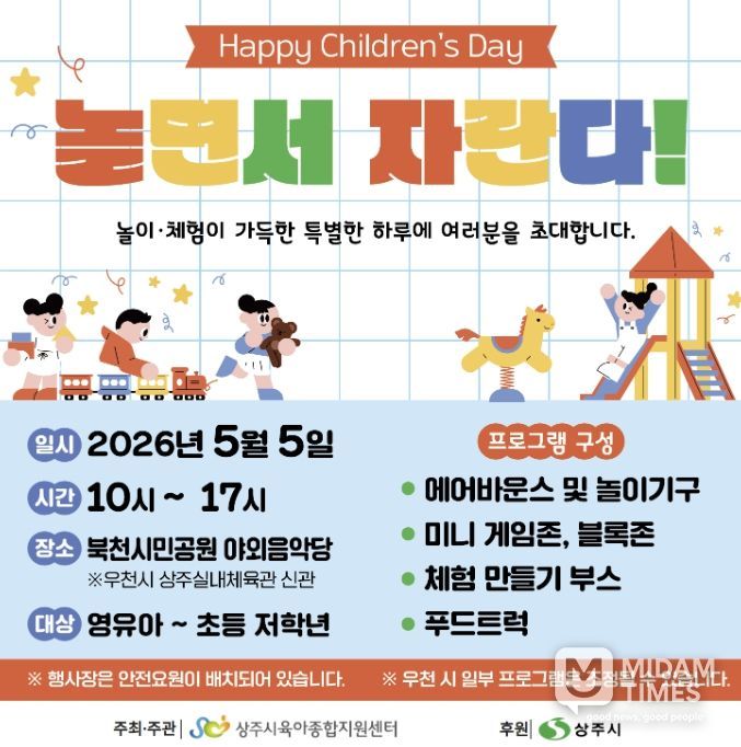 미담타임스 김준완 기자 | 상주시는 제104회 어린이날을 맞아 오는 5월 5일 북천시민공원 야외음악당에서 ‘Happy Children`s Day – 놀면서 자란다!’를 주제로 어린이날 기념행사를 개최한다.