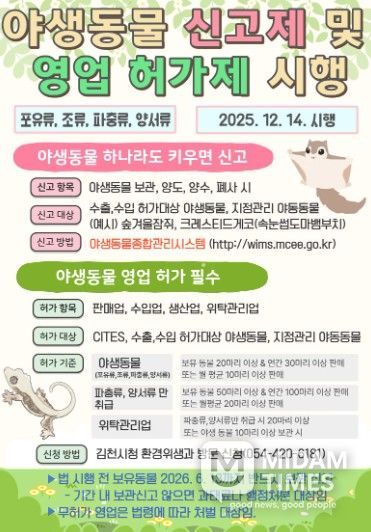 미담타임스 김준완 기자 | 김천시는 야생동물의 무분별한 포획·거래를 방지하고 건전한 사육 문화를 정착시키기 위해 야생동물 영업 허가제와 보관·거래 신고제를 시행하고 있다고 밝혔다.