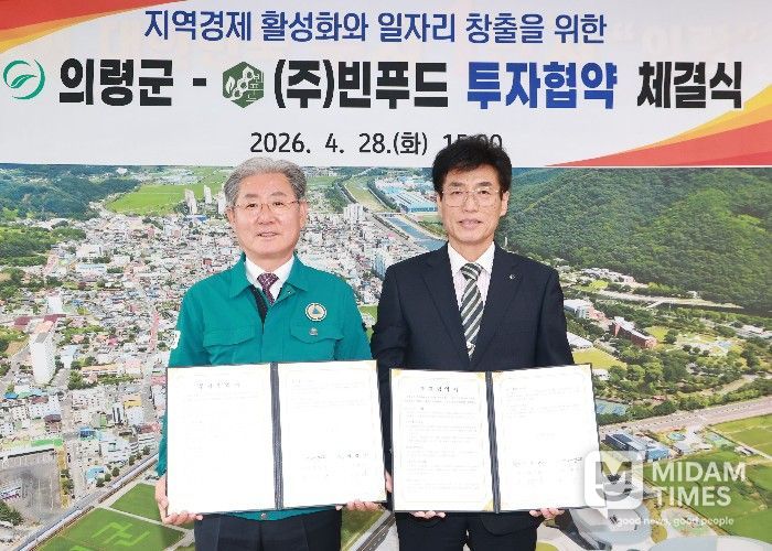 미담타임스 황명수 기자 | 의령군은 지난 28일 군수실에서 ㈜빈푸드(대표 홍효선)와 투자협약(MOU)을 체결했다고 밝혔다.