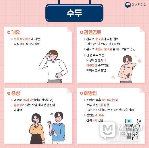 수두는 수두-대상포진 바이러스에 의해 발병하는 급성 바이러스성 질환으로, 발열과 함께 온몸에 수포성 발진이 나타나는 것이 특징이다.