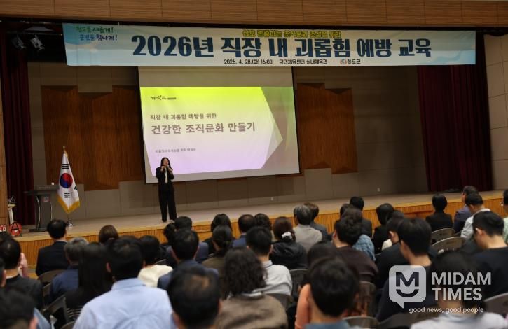 미담타임스 김준완 기자 | 청도군은 4월 28일 국민체육센터 실내체육관에서 김동기 청도군수 권한대행을 비롯한 간부 공무원과 전 직원이 참석한 가운데 ‘2026년 직장 내 괴롭힘 예방 교육’을 실시했다.