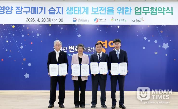 미담타임스 김준완 기자 | 영양군은 대구지방환경청, 국립생태원, ㈜KT&G와 4월 28일, 영양 장구메기 습지 생태계 보전을 위한 업무협약을 체결했다.