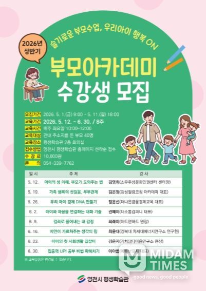 미담타임스 김준완 기자 | 영천시 평생학습관은 5월 1일부터 11일까지 ‘2026년 상반기 부모아카데미’ 수강생을 모집한다.
