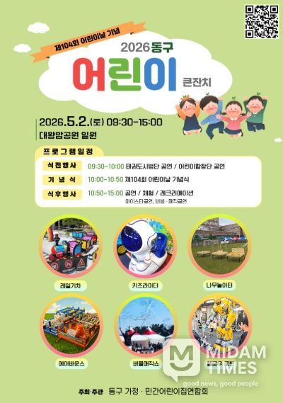 동구 관계자는 “어린이가 주인공인 어린이날 행사에 많이 참여해 주기 바란다”라며 “어린이가 미래의 주인공으로 잘 성장할 수 있도록 아동 돌봄에 최선을 다하여 아이 키우기 좋은 동구를 만드는 데 힘쓰겠다”라고 말했다.