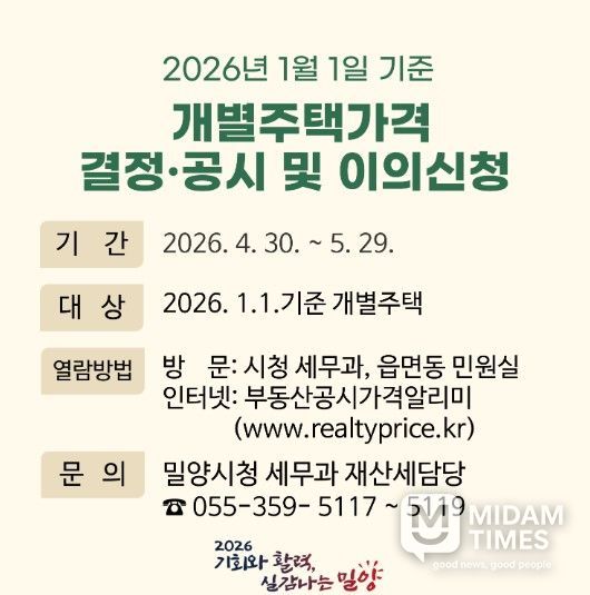 미담타임스 황명수 기자 | 경남 밀양시는 2026년 1월 1일 기준 개별주택 2만 7,525호에 대한 주택가격을 오는 4월 30일 결정·공시하고, 5월 29일까지 이의신청을 접수한다고 밝혔다.