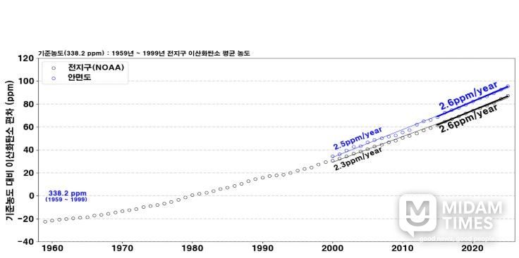 보고서에 따르면 우리나라의 2025년 이산화탄소 배경농도(432.7 ppm, 2024년 429.5 ppm)는 전지구 평균(425.6 ppm, 2024년 422.8 ppm)보다 7.1 ppm 높은 수준을 기록했다. 전년 대비 3.2 ppm 상승해 최근 10년(2015~2024) 기간 중 두 번째로 큰 연간 증가폭을 보였다. 또한, 우리나라에서 가장 오랜 기간(1999년~) 관측해 온 안면도 이산화탄소 관측 결과를 근거로 우리나라 이산화탄소 배경농도는 2000년 이후 연 2.5 ppm씩 높아지고 있고, 최근 10년에는 연 2.6 ppm의 속도로 증가하고 있다고 밝혔다. 아울러, 전지구 평균 증가 속도는 2000년 이후 연 2.3 ppm, 최근 10년 연 2.6 ppm이다.