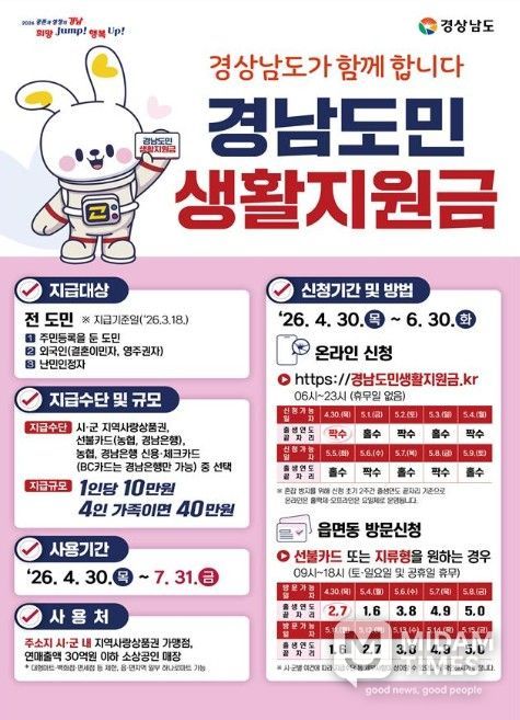 미담타임스 황명수 기자 | 경상남도는 4월 30일부터 전 도민을 대상으로 한 ‘경남도민 생활지원금’ 지급 신청을 본격적으로 시작한다고 밝혔다. 이번 지원금은 고물가 등 어려운 경제 여건 속에서 도민들의 생계 부담을 덜고, 지역 내 소비를 촉진해 민생 경제에 활력을 불어넣기 위해 마련됐다.