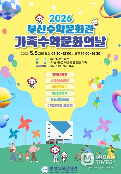 미담타임스 남혜영 기자 | 부산광역시교육청창의융합교육원은 가정의 달을 맞아 오는 오는 5월 5일 부산수학문화관에서 유·초·중·고 학생과 가족을 대상으로 ‘가족 수학 문화의 날’ 행사를 개최한다.