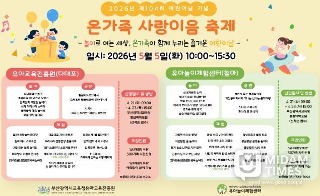미담타임스 남혜영 기자 | 부산광역시교육청유아교육진흥원은 제104회 어린이날을 맞아 오는 5월 5일 오전 10시부터 유아교육진흥원(다대포)과 유아놀이체험센터(철마)에서 3~5세 유아와 학부모가 참여하는‘온가족 사랑이음 축제’를 개최한다.