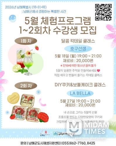 미담타임스 황명수 기자 | 남해군 도시재생지원센터가 신록이 짙어가는 5월을 맞아, 군민들에게 일상 속 특별한 미식 경험과 힐링을 선사할 ‘5월 쿠킹클래스’를 마련하고 수강생 모집에 나선다.