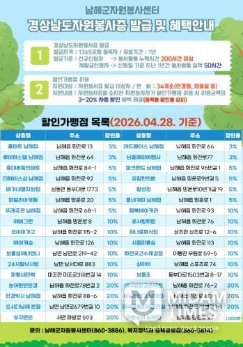 미담타임스 황명수 기자 | 남해군은 경상남도 자원봉사증 발급자를 대상으로 제공되는 할인가맹점 혜택을 확대하기 위해 관내 할인가맹점 10개소를 추가했다고 밝혔다.