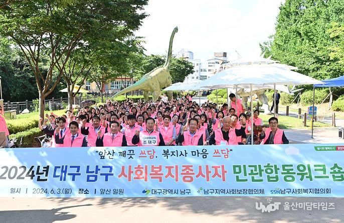 남구지역사회보장협의체와 남구사회복지협의회가 함께 마련한 "2024년 남구사회복지종사자 민관합동워크숍"에는 지역의 민간기관 사회복지종사자와 사회복지 담당 공무원 등 150여명이 참석하여, 앞산 일대에서‘앞산사랑 플로깅’을 실시하고, 고산골 공룡공원에서‘역량 강화 워크숍’의 시간을 가졌다.
