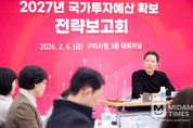미담타임스 김준완 기자 | 구미시는 지난 6일 시청 대회의실에서 실·국·소장과 부서장 등 100여 명이 참석한 가운데‘2027년 국가투자예산 확보 전략보고회’를 열고, 역대 최대 규모 국비 확보를 위한 본격 행보에 돌입했다. 이번 보고회는 2027년도 국비 확보 목표액을 9,300억원 이상으로 설정하고, 시의 미래 성장을 견인할 신규 사업과 현안 사업을 중심으로 정부예산 편성 기조에 맞춘 전략적 대응 방안을 논의하기 위해 마련됐다. 보고회에서는 부서별로 발굴된 신규 사업의 타당성을 면밀히 검토하고, 공모사업 추진을 위한 사전절차 이행 상황을 점검했다. 특히 여러 부서의 협업이 필요한 현안 사업에 대해서는 공동대응 전략을 마련해 행정 효율성을 높이기로 했다. 분야별 주요 국비 확보 대상 사업도 구체화했다. 경제분야는 △첨단반도체 소재·부품 Complex 구축 △국방반도체 클러스터 지정 △AI·방산 특화 공유공장 구축 △지역 주력 중소기업형 인공지능 데이터 가공 지원 △AX 자율제조 사이버융합보안 실증 지원 △차세대 배터리 전극제조 장비부품 테스트베드 구축 등이다. 사회간접자본(SOC)분야