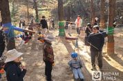 미담타임스 박민정 기자 | 울산광역시교육청은 지난 29일과 6일 울주군 선바위 공원 일원에서 울산지역 영유아 가족을 대상으로 자연 속 놀이 체험 프로그램인 ‘솔솔 팝업 놀이터-숲 밧줄 생태 놀이’를 운영했다. 이번 행사는 영유아들이 보호자와 함께 지역의 자연환경을 마음껏 즐기고, 다양한 신체 활동을 경험하며 몰입의 즐거움과 스스로 해냈다는 자신감을 경험할 기회를 제공하고자 마련됐다. 이날 행사에는 울산에 거주하는 0~5세 영유아와 보호자 등 가족 167팀이 참여했으며, 안전한 환경에서 자유롭고 충분한 체험을 즐길 수 있도록 하루 3회차로 나눠 진행됐다. ‘솔솔 팝업 놀이터’는 아이들의 모험심과 창의력을 자극하는 다채로운 프로그램으로 꾸며졌다. 참가 가족들은 숲에서 즐기는 밧줄 놀이로 짚라인, 외줄 다리, 바구니 그네, 무지개 트램펄린과 자연물로 만드는 크리스마스 장식, 대나무 놀이 등 생태 활동을 함께하며 가족 간의 유대감을 쌓고 즐거운 추억을 만들었다. 특히, 자연에서 즐기는 밧줄 놀이는 아이들이 자기의 신체 움직임을 조절하며 도전 의식을 키울 수 있어 학부모들의 큰 호응을 얻었다.