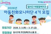 미담타임스 전해찬 기자 | 대구 달서구는 아동 정책에 대한 의견을 제시하고 아동권리 증진 활동에 참여할‘아동친화모니터단 4기’단원을 오는 27일까지 모집한다. 달서구 아동친화모니터단은 아동이 행복한‘아동친화도시 달서구’조성을 위한 아동참여기구로, 달서구에 주민등록을 둔 만 7세 이상 18세 미만의 초·중·고등학생 및 학교밖청소년이면 누구나 신청할 수 있다. 모집 인원은 30명 내외다. 공개모집 또는 기관 추천을 통해 선발된 단원들은 4월 위촉식을 시작으로 2년간 활동하며 ▲ 아동친화도시 조성을 위한 정책 제언, ▲ 아동권리 교육 및 캠페인 참여, ▲ 아동권리 모니터링 등 다양한 활동에 참여하게 된다. 달서구는 지난 2020년 1기 출범 이후 아동친화모니터단을 운영하며 아동이 지역사회 정책에 참여하고 아동 권리 증진 활동에 직접 참여할 수 있는 기회를 지속적으로 확대해 왔다. 참여를 희망하는 아동·청소년은 신청서를 작성해 달서구청 아동친화과로 방문 접수하거나 이메일로 제출하면 된다. 신청서 서식은 달서구청 홈페이지 또는 모집 포스터의 QR코드를 통해 내려받을 수 있다. 이태훈