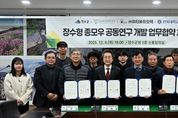 미담타임스 정인화 기자 | 장수군은 장수한우지방공사, 이티바이오텍(주), 전북대학교와 장수군청 회의실에서 장수한우 품질 고급화를 위한 ‘장수형 저탄소 종모우 개발’ 공동연구 상호협력 업무협약(MOU)을 체결했다고 11일 밝혔다. 이번 협약은 협약기관 간 상호 업무협조 체계를 구축해 장수 한우 산업의 경쟁력을 높이기 위한 장수 지역 사양환경에 적합한 우수 유전자원을 확보하고, 탄소배출을 줄이면서도 생산성과 품질을 높일 수 있는 종모우 개발을 위해 마련됐다. 특히 종모우 개발을 통해 장수 한우 고유의 유전형질을 확립하고 탄소배출 저감과 생산성 향상을 동시에 달성하는 것이 핵심 목표다. 협약에 따라 군은 저탄소 종모우 개발을 위한 사업 총괄 및 행·재정적 지원을 하고 장수한우지방공사는 채정·가공·사양관리와 농가 컨설팅에 나선다. 또한 이티바이오텍은 유전체 기반 연구개발을 진행하고 전북대학교는 유전 능력 평가와 우량 암소·후보 종모우 선발을 각각 담당한다. 장수군은 이번 공동연구를 최근 지정된 전북특별자치도 농생명산업지구 내 ‘저탄소한우 산업지구’ 조성사업과 연계해 2030년까지 단계적으로 추