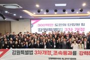 미담타임스 정인화 기자 | 강원특별자치도 범국민추진협의회(협의회장 최양희, 추진단장 김천수)가 11월 21일 11시, 춘천 스카이컨벤션 2층 컨벤션홀에서 강원특별법 3차개정 조속 통과 촉구 결의대회를 개최했다. 당초 정기총회를 개최할 예정이었으나 어제(11월 20일) 국회 행정안전위원회 법안소위에서 강원특별법 3차 개정이 논의가 불발되자 긴급 행동에 나섰다. 이날 결의대회에는 범추협 위원들을 비롯해 고문직을 맡고 있는 김진태 도지사, 김시성 도의회 의장 등 200여 명이 참석하여 조속 통과를 촉구하는 목소리를 높였다. 최양희 협의회장은 “오늘은 강원특별자치도의 성과를 함께 축하하는 날이 돼야 했지만, 어제 행안위에서 3차 개정을 또 미루는 바람에 오히려 우리의 결의를 더 크게 보여줘야 하는 날이 됐다”라며, “각 지역에서 올라오신 위원 여러분의 지혜와 네트워크가 어느 때보다 절실하다”라고 말했다. 김진태 강원특별자치도지사는 “3차 개정안이 처음 국회에 올라간 게 작년 9월인데, 1년이 넘도록 단 한 번도 심사를 하지 않았다”라며, “5극 3특을 강조하면서 특별자치도 법은 시간이 없다고 국회 심사가 미뤄지는
