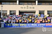 미담타임스 정인화 기자 | 여수MBC 순천이전을 저지하기 위한 여수시민들의 외침이 도심 한가운데 울려 퍼졌다. 15일 여수시에 따르면, 이날 오후 3시 여수시와 여수시의회, 시민사회단체로 구성된 ‘여수MBC 순천이전 반대 범시민대책위원회’는 시의회 청사 1층 공감뜨락에서 ‘여수MBC 지키기! 대시민 토론회 및 결의대회’를 가졌다. 이날 대회는 범대위 공동위원장인 여수시장과 시의장, 범대위 회원을 비롯해 시민과 시의원 등 3백여 명이 참석한 가운데, 1부 대시민토론회와 2부 결의대회 순으로 진행됐다. 이들은 결의문에서 “시민 의견을 배제하고 공론화 과정 없이 일방적으로 추진한 여수MBC 순천이전을 즉각 중단하라”며, “이전 계획을 철회하고 공영방송의 책무를 다하라”고 촉구했다. 정기명 시장도 “여수MBC는 지금이라도 시민들께 사죄하고 대화에 나서라”며, “대화를 통해 시민적 합의만 이뤄진다면 시는 어떠한 제안도 수용할 준비가 되어있는 만큼 이 위기를 함께 헤쳐 나가자”고 밝혔다. 한편, 참석자들은 행사를 통해 결의를 다지고, 여수시의회를 출발해 KB국민은행과 (구)송원백화점, 해양경찰서,