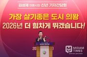 미담타임스 정주환 기자 | 김성제 의왕시장이 5일 시청 대회의실에서 2026년 신년 기자간담회를 열고 민선8기 의왕시 주요성과와 2026년 시정 운영방향에 대해 설명하는 시간을 가졌다. 김 시장은 “지난 3년 반은 의왕시의 새로운 미래를 준비하며 역동적으로 도약해 온 시간이었다”며, “대규모 도시개발과 복선전철 사업을 비롯해 교육과 복지, 문화‧예술, 일자리, 안전에 이르기까지 도시 전반에 걸쳐 혁신적인 변화를 만들어 왔다”고 평가했다. 특히, 오랫동안 해결되지 못했던 숙원사업들이 해결된 것을 의왕시의 주요 성과로 설명하며, 대표적인 사례로 의왕 문화예술회관 착공, 인덕원~동탄 및 월곶~판교 복선전철 착공, 내손중고통합학교 개교, 의왕 종합병원 유치 등을 꼽았다. 또한, 초평지구와 청계2지구 내 기업·투자 유치, 부곡커뮤니티센터 착공, 의왕역~판교 간 프리미엄버스 및 초평동 똑버스 신설, 의일로2 개통 등 도로망 확충, 22개 맨발걷기길 조성, 백운호수 생태탐방로 및 백운호수공원 개장, 의왕야구장 및 금천천 파크골프장 개장, 글로벌인재센터 부곡분원 개소, 노인 버스 무료승차 지원사업 추진, 장애인 힐링쉼터 개소