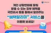 미담타임스 조혜리 기자 | 개인 상황변화에 맞춰 받을 수 있는 정부 혜택을 국민비서 등을 통해서 알려주는 "혜택알리미" 서비스를 이용해 보세요! · 알림 대상 혜택 행정·공공기관이 제공하는 모든 공공서비스(6,000여종) · 이용 대상 국민 누구나(*만 14세 미만 제외) · 이용 방법 ① 정부24 접속 ② 혜택알리미 가입·이용 *다음 페이지 참고 ■ 혜택알리미 이용 동의 방법 ① 정부24 웹페이지 또는 정부24 어플을 통해 접속해 주세요. ■ 혜택알리미 이용 동의 방법 ② 모바일에선 정부24 하단에 "혜택알림"을 통해 바로 접속 가능해요. ■ 혜택알리미 이용 동의 방법 ③ 동의 후 맞춤 혜택 알림 받기를 클릭해주세요. 본인인증 이후 이용동의를 진행해 주세요. ■ 혜택알리미 이용 동의 방법 ④ 정부24 회원가입 시 혜택알리미 서비스 이용동의를 선택해 주세요. - 혜택알리미 이용약관에 동의하면, 맞춤혜택 알림 등 다양한 서비스를 제공받을 수 있어요! ■ 혜택알리미 이용 동의 방법 ⑤ 회원가입을 위한 회원 정보를 입력하고 간편인증을 진행해 주세요. -
