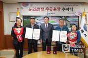 미담타임스 황명수 기자 | 김해시는 6·25전쟁에 참전해 혁혁한 전공을 세웠으나 전후 혼란한 상황으로 인해 그동안 훈장을 받지 못했던 고 강소용 하사, 고 석종철 일병 유족에게 국방부장관을 대신해 화랑무공훈장을 전수했다고 2일 밝혔다. 이는 국방부와 육군이 추진하는 ‘6·25 무공훈장 찾아주기 사업’을 통해 70여년만에 명예를 되찾아드린 의미 있는 자리였다. 고 강소용 하사는 1951년 28세의 나이에 입대해 강원 고성지구 전투에서 전사했고 고 석종철 일병은 1950년 26세의 나이에 입대해 강원 홍천지구 전투에서 혁혁한 공을 세우고 전사했다. 훈장을 전수받은 유족들은 "조국을 위해 헌신하신 선친들의 명예를 70년 만에 되찾아주신 것에 깊이 감사드리며, 이런 뜻깊은 자리를 마련해주신 시에도 감사드린다”고 말했다. 김해시 관계자는 “이제라도 참전유공자분들의 고귀한 희생을 기리고 명예를 회복시켜 드릴 수 있어 기쁘고 영광스럽다. 국가유공자들의 합당한 예우를 강화하고 그 명예를 드높이는 데 노력하겠다”고 말했다.