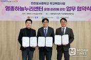 미담타임스 정주환 기자 | 영종구 출범 원년을 맞아 올해 새롭게 개관한 ‘영종하늘누리센터’의 안정적·체계적 운영을 위해 인천시 중구가 인천시 교육청, 운서중학교와 손을 맞잡았다. 김정헌 인천 중구청장과 도성훈 인천시 교육감, 김성오 운서중학교장은 10일 오후 영종하늘누리센터 하늘배움터에서 이러한 내용의 ‘인천운서중 학교복합시설(영종하늘누리센터)의 운영과 관리에 관한 업무 실시협약’에 서명했다. ‘영종하늘누리센터’는 인천 중구가 운서중학교 부지 내 일부를 무상으로 제공받아 하늘초롱길 69 일원에 지하 1층, 지상 4층 연면적 5,635㎡ 규모로 건립한 ‘학교복합시설’이다. 지난 2024년 6월 첫 삽을 떠 올해 1월 건립 공사를 모두 마쳤으며, 3월 준공식을 개최한 후 현재는 운영 본격화에 행정력을 집중하고 있다. 특히 다함께돌봄센터 7호점(거점형), 육아종합지원센터, 가족센터, 영종하늘누리 작은도서관이 지난 2월부터 입주해 다양한 복지·문화 서비스를 구민들에게 제공하고 있다. 이번 협약은 지난 2021년 영종하늘누리센터 건립을 위해 체결한 기본 업무협약의 내용을 한층 더 구체화함으로써