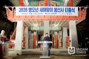 미담타임스 정주환 기자 | 진접읍 봉선사에서 2026년 희망 가득한 새해를 기원하는 제야의 종소리가 울려 퍼졌다. 남양주시의회(의장 조성대)는 31일 진접읍에 위치한 대한불교조계종 제25교구 봉선사(주지 호산스님)에서 열린‘2026년 봉선사 새해맞이 타종식’에 참석해 시민들과 함께 병오년(丙午年) 새해의 힘찬 출발을 함께했다. 봉선사가 주관한 이날 행사는 조성대 의장을 비롯해 이정애 부의장, 이경숙 복지환경위원장, 김지훈(국) 의원, 김동훈 의원, 이수련 의원, 김상수 의원, 손정자 의원 및 주광덕 남양주시장, 지역 국회의원, 봉선사 관계자 및 신도, 지역주민 등 300여명이 참석했다. 행사는 송년법회를 시작으로 △교구장 호산스님의 인사말씀 △새해 덕담 및 송년 인사 △발원문 △봉선사 대종 소개 △타종 순으로 진행됐으며, 한파로 인한 추운 날씨 가운데서도 타종식에 참석한 시의원들과 시민들은 덕담과 따뜻한 온기를 나누며 훈훈한 새해를 함께 맞이했다. 특히, 주요 내외빈의 타종 이후 일반 시민들도 함께 타종자로 참여하는 순서를 마련해 새해맞이 타종식의 의미를 더했다. 조성대 의장은 “시민