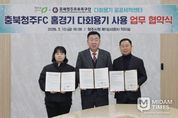 미담타임스 김준완 기자 | 청주시는 13일 충북청주 프로축구단(충북청주FC), 다회용기 공공세척센터와 함께 충북FC 홈경기 다회용기 사용 확대를 위한 업무협약을 체결했다. 임시청사 직지실에서 진행된 협약식에는 이범석 청주시장, 김현주 충북청주FC 대표, 김은숙 청주시 다회용기 공공세척센터 대표가 참석했다. 이번 협약은 축구 경기 관람 과정에서 대량으로 발생하는 일회용기 문제를 구조적으로 개선하고, 시민이 일상에서 자연스럽게 자원순환을 실천할 수 있는 친환경 스포츠 문화를 확산하기 위해 마련됐다. 협약에 따라 청주시와 충북청주 프로축구단, 다회용기 공공세척센터는 2026년 시즌 예정된 충북청주 프로축구단 홈경기 16경기에서 다회용기 사용한다. 경기장 내 다회용기 사용과 반납 체계를 구축하고, 회수·세척·재공급 전 과정을 안정적으로 운영해 ‘쓰레기 없는 경기장’ 조성을 공동으로 추진할 계획이다. 각 기관은 역할 분담을 통해 협력을 강화한다. 충북청주 프로축구단은 경기장 현장 운영과 관람객 및 푸드트럭 사업자 대상 안내 및 캠페인을 맡고, 청주시는 행정 지원과 정책 연계를 담당한다. &nb