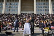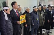 미담타임스 정인화 기자 | 9일부터 국회 천막농성을 이어가고 있는 김진태 강원특별자치도지사가 2월 10일 국회 행정안전위원회 제1법안심사소위원회 회의실 앞에서 ‘투쟁’이라고 적힌 머리띠를 두르고 강원특별자치도법 3차 개정안의 조속한 심사를 강력 촉구했다. - 이날 국회 행안위 법안심사소위에서는 행정통합특별법이 상정돼 심사가 진행 중이며, 해당 법안은 11일까지 논의가 이어질 예정이다. 이 자리에는 유상범 국회의원(홍천・횡성・영월・평창)도 ‘강원도민의 삶을 바꾸는 선택. 강특법 3차 개정 즉각 통과’라고 적힌 피켓을 들고 행정안전위원회 의원들에게 강원특별법 3차 개정안의 조속한 처리를 요청했다. 김 지사는 “행정통합 시도인 5극은 빠른 속도로 국회 심사대에 오른 반면, 정부 부처 협의까지 마친 강원특별법 3차 개정안은 17개월 째 단 한 차례도 법안심사 논의가 이뤄지지 않았다”며 강한 유감을 표했다. 이어 “강원・전북・제주・세종, 이른바 3특과 행정수도 특별법안 역시 균형발전 차원에서 신속히 처리돼야 한다”고 강조했다.