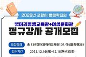 미담타임스 김준완 기자 | 포항시평생학습원은 2026년도 정규 강좌 운영을 위해 미래사회 변화에 대응할 역량을 갖춘 전문 강사 138명을 공개 모집한다고 2일 밝혔다. 모집 분야별 인원수는 뱃머리평생교육관 일반성인 강좌 58명과 시니어 강좌 30명 및 청소년 강좌 16명, 그리고 여성문화관 정규강좌 34명이다. 자격증·직업능력·문화예술·건강·정보화·외국어·스포츠 등 기존에 수요가 높은 과목뿐 아니라, 지난 11월에 발표된 교육부의 ‘AI for All’ 정책에 맞춰 생애주기별 AI 강좌를 신규 편성해 해당 강사를 모집한다. 또한 고령층을 위한 실버 분야 자격증 강좌를 여성문화관에 새로 개설해 변화하는 학습 수요와 사회적 요구를 반영할 계획이다. 강사 모집 일정은 다음과 같다. 서류 접수는 오는 16일부터 18일까지 방문 접수로 진행되며, 응시자격은 해당 분야의 전문지식과 강의 경험 보유자, 교원자격증 소지자, 관련 자격증 소지자 등이다. 서류합격자는 12월 24일 문자로 개별 통보되고, 최종 합격자는 12월 29일 평생학습원 홈페이지를 통해 발표된다. 자세한
