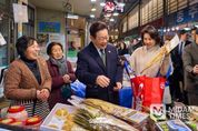 미담타임스 김교환 기자 | 이재명 대통령과 김혜경 여사는 오늘 낮, 설 명절을 앞두고 충북 충주시에 위치한 무학시장을 찾아 지역 세밑 물가를 점검하고 상인들을 만나 현장 의견을 청취했다. 무학시장은 지난 1978년 노점상들의 정착을 위해 개설된 전통시장이며, 이번 방문은 설 민심을 청취하기 위한 민생 행보의 일환이다. 이 대통령과 김 여사는 시장 내 여러 상점을 들러 “새해 복 많이 받으세요”라며 인사를 했고, 상인과 시민들은 환호와 박수로 이 대통령 부부를 맞았다. 이 대통령 부부에게 더덕을 판매한 상인은 “덕분에 마수걸이를 한다”며 “오늘 장사가 잘될 것 같다”고 말해 웃음을 자아냈다. 다른 상인들도 “힘나게 해주셔서 감사하다”, “너무 고생 많으시다”며 인사를 전했다. 이 대통령 부부는 황태포, 시금치, 곶감과 깐밤 등 제수용품과 먹거리를 구입했고 백도라지, 마른 멸치, 배추전 등을 즉석에서 맛보기도 했다. 이 대통령 부부는 온누리상품권과 현금으로 결제했다. 김 여사가 물건을 고르는 사이 이 대통령은 상인들에게 “장사는 잘 되느냐”, “곧 설인데 어떠시냐”고 물었다. 정육점 사장은