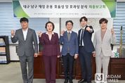 미담타임스 김교환 기자 | 대구광역시 남구의회 의원연구단체 ‘대구 남구 살림살이 연구회’는 10월 22일 남구의회 제2소회의실에서 ‘대구 남구 재정 운용 효율성 및 효과성 분석 연구’ 최종보고회를 개최했다. 이번 연구는 지난 6월부터 진행됐으며, 남구 재정의 구조적 문제를 다각도로 검토하기 위해 9월 중간보고회를 열고, 경기도 광명시의 우수사례를 비교·분석하는 등 현장 중심의 검토 활동을 이어왔다. 이날 보고회에서는 중간보고에서 제시된 건의사항과 선진사례 분석 결과를 종합한 최종보고서 내용이 발표됐으며, 남구 재정운용의 효율화 방안을 주제로 심도 있는 토론이 진행됐다. 연구단체 구성 의원들은 “이번 연구용역을 통해 남구 재정의 현황과 개선 방향을 구체적으로 확인할 수 있었다”며, “의회의 감시와 견제 기능을 강화해 구민의 눈높이에 맞는 합리적 예산 운영이 이루어지도록 노력하겠다”고 밝혔다. 강민욱 연구단체 대표의원은 “지방재정은 단순한 숫자의 조정이 아니라 지역의 미래를 설계하는 전략적 수단”이라며, “이번 연구를 통해 구조적 문제를 진단하고 구민이 체감할 수 있는 효율적 재정운용 방향을 마련해,