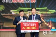 미담타임스 김교환 기자 | 통영시는 18일 정점식(국민의힘/경남 통영시고성군) 국회의원이 연말을 맞아 취약계층을 돕기 위한 성금 500만원을 기탁했다고 밝혔다. 정점식 국회의원의 이번 기탁은 단발성 후원이 아닌, 지역사회와의 꾸준한 연대라는 점에서 의미를 더하고 있다. 매년 연말마다 이어진 나눔은 이웃들에게 희망의 메시지를 전하는 계기가 되고 있으며, 지역사회 전반에 나눔의 분위기를 확산시키고 있다. 정점식 국회의원은 “지역을 위해 무엇을 할 수 있을지 늘 고민해 왔다”며 “이번 성금이 도움이 꼭 필요한 이웃들에게 작은 버팀목이 되기를 바란다”고 말했다. 이어 “앞으로도 지역과 함께 숨 쉬는 나눔을 지속해 나가겠다”고 덧붙였다. 천영기 통영시장은 “지역사회를 향한 꾸준한 관심과 실천이 통영을 더욱 따뜻하게 만들고 있다”며 “담아주신 뜻이 현장에서 온전히 이어질 수 있도록 책임 있게 사용하겠다”고 감사의 마음을 전했다. 한편, 이번에 전달된 성금은 경남사회복지공동모금회의 지역연계모금사업인 ‘통영 행복펀드’에 적립돼 복지 사각지대 해소와 지역 맞춤형 복지사업 추진을 위한 재원으로 활용될 예