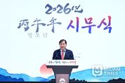 미담타임스 정인화 기자 | 제주특별자치도가 ‘제주 먼저 미래로’를 기치로 인공지능(AI)·에너지·우주산업을 중심으로 미래 제주 건설에 나선다. 제주도민이 에너지를 사고파는 ‘재생에너지 연금’을 도입하고, 스마트 복지 생태계를 구축해 청년들이 제주에서 배우고 일하며 살 수 있는 기반을 만든다는 계획이다. 오영훈 제주도지사는 2일 오전 문예회관 대극장에서 열린 2026년 시무식에서 "글로벌 대전환 속에서 마침내 제주에 기회가 찾아왔다”며 이같이 밝혔다. 이날 시무식에는 도 및 행정시, 도내 공공기관장 등 800여 명이 참석했다. 시무식은 청년 밴드 공연으로 시작됐다. 이어 상영된 도민 영상에서는 관광 활성화, 청년 일자리 확대, 양육비 지원, 임대주택 확충, 장애인 고용 개선, 탄소중립 청년 참여 등 경제·복지·일자리·주거·환경 전반에 걸친 바람이 쏟아졌다. 오 지사는 지난해 성과로 내란 사태 극복을 통한 관광객 수 플러스 전환(12월 12일), 고향사랑기부 100억 원 돌파, 1차산업 조수입 5조 원 달성, 싱가포르 축산물 수출, 분산에너지 특구 지정 등을 제시했다. 동시에