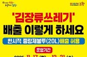 미담타임스 김준완 기자 | 포항시는 김장철을 맞아 일시적으로 다량 배출되는 김장부산물 쓰레기를 원활히 처리하기 위해 ‘김장부산물쓰레기 특별 수거기간’을 운영한다고 밝혔다. 특별 수거기간은 11월 17일부터 12월 31일까지 약 6주간 진행되며, 이 기간 동안 발생하는 김장부산물 쓰레기는 한시적으로 종량제봉투 20L에 배출이 허용된다. 시는 유동인구가 많은 읍·면·동 주요 지역에 현수막을 설치해 특별 수거기간을 홍보하고, 각 행정복지센터를 통해 올바른 김장쓰레기 배출 방법과 관리 기준을 시민들에게 안내하고 있다. 음식물쓰레기 배출대상은 배추·무 등 김장으로 나오는 쓰레기로 최대한 물기 및 이물질 제거 후 일반쓰레기와 별도로 배출하여야 한다. 또한 일반쓰레기 배출대상은 배추겉잎, 밑동, 양파·마늘껍질, 생강 및 흙이 묻은 식재료로 종량제봉투로 배출해야 한다. 포항시 관계자는 “김장철에는 부산물쓰레기가 짧은 기간에 집중적으로 발생하는 만큼 특별 수거기간을 운영하게 됐다”며 “올바른 배출 방법을 적극적으로 안내해 부산물쓰레기 수거에 차질이 없도록 최선을 다하겠다”고 말했다.