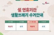 미담타임스 김준완 기자 | 성주군은 설 명절을 맞아 귀성객과 주민들이 쾌적한 환경 속에서 명절을 보낼 수 있도록 2월 2일부터 2월 20일까지 '설 연휴 쓰레기 종합관리대책'을 추진한다. 군은 연휴 기간 귀성객과 군민의 생활 불편을 최소화하기 위해 연휴를 전·중·후로 구분한 대응체계를 마련한다. 연휴 전에는 주요거리 등의 쓰레기 중점 수거와 환경정비를 실시하고 음식물쓰레기 증가에 대비한 비상 수거용기를 비치한다. 연휴 중에는 특별상황반을 운영해 생활폐기물 처리와 민원에 대응하며, 읍·면의 상황반과 비상연락체계를 유지한다. 연휴 이후에는 마무리 대청소와 노면청소차 운영을 통해 깨끗한 환경 조성에 힘쓸 계획이다. 특히 명절 선물 포장 등으로 스티로폼 상자와 종이박스 배출이 증가할 것으로 예상됨에 따라, 관내 유통업소에서 판매되는 설 선물류의 과대포장 및 재포장 행위에 대해서도 점검을 실시한다. 또한 주민들에게 배출장소 내 무분별한 투기를 예방하기 위한 지도·단속과 함께 재활용품 올바른 분리배출 방법에 대한 홍보를 강화할 예정이다. 자원순환사업소 관계자는 “설 명절 기간 생활폐기물 발생량이 급증할 것으로 예상된다”며