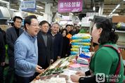미담타임스 정인화 기자 | 김영록 전라남도지사는 13일과 16일 광양 중마시장과 여수 서시장주변시장을 방문, 물가 상승과 고금리 등에 따른 소비심리 위축으로 어려운 상인들을 격려하고 지역사랑상품권으로 장보기 행사를 펼친다. 김영록 지사는 13일 명절 물가 동향을 살피며 전남·광주 통합 추진에 따른 민생경제 지원 대책을 설명하고, 지역사랑상품권으로 설 제수용품과 지역특산품을 구매하며 상인들을 격려하고 애로사항을 청취했다. 특히 시장 상인들과 소통하며 지역경제의 근간인 시장 상인들이 안정적으로 영업하고 번창하도록 적극 지원할 것임을 밝혔다. 전통시장을 찾은 이용객과 인사를 나누며 넉넉한 인심이 있는 전통시장에 자주 방문할 것을 권장하고 가족과 함께 건강하고 풍요로운 명절을 보내길 바라는 덕담도 나눴다. 김영록 지사는 “지역경제와 직결된 공간인 전통시장 활성화 시책을 적극 발굴하고 지역 소상공인과 소통을 강화할 것”이라며 “도민들께서 지역 전통시장이 활기를 찾도록 많이 이용하길 부탁드린다”고 말했다.